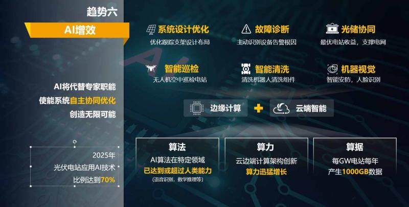 人工智能AI賦能光伏,從萬物互聯(lián)到萬物智能。受益于人工智能及物聯(lián)網(wǎng)技術(shù),通過集成海量的專家經(jīng)驗(yàn)和不斷的自學(xué)習(xí),讓算法、算力、算據(jù)在計(jì)算中發(fā)揮最大作用,AI將很大程度上代替運(yùn)維專家進(jìn)行診斷決策。通過智能跟蹤算法,讓組件、支架、逆變器協(xié)同運(yùn)行,找到最佳角度,釋放最大潛力。智能IV診斷,精準(zhǔn)定位故障,將運(yùn)維工作量從“月”降低到“分鐘”。無人機(jī)空中巡檢電站、清洗機(jī)器人清洗組件、智能安防和人臉識別等技術(shù),使光伏電站不斷完善系統(tǒng)設(shè)計(jì)優(yōu)化、故障診斷、光儲(chǔ)協(xié)同、智能巡檢、智能清洗、機(jī)器視覺,全面提升發(fā)電效率和重構(gòu)運(yùn)維體驗(yàn)。從而助力電站生產(chǎn)力和安全性提升。預(yù)計(jì),2025年光伏電站應(yīng)用AI技術(shù)比例達(dá)到70%。