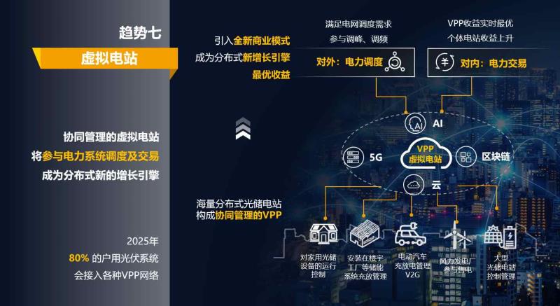 5G、區(qū)塊鏈、云服務(wù)等ICT技術(shù)的大規(guī)模應(yīng)用于分布式電站,組成協(xié)同管理的虛擬電站(VirtualPowerPlant)參與到電力系統(tǒng)的調(diào)度、交易與輔助服務(wù)中。未來5年,虛擬電站技術(shù)的發(fā)展會(huì)在分布式光伏場景中衍生出新的商業(yè)模式,以及新的市場參與者,成為分布式新的增長引擎。預(yù)計(jì)2025年,80% 的戶用光伏系統(tǒng)會(huì)接入各種VPP網(wǎng)絡(luò)。