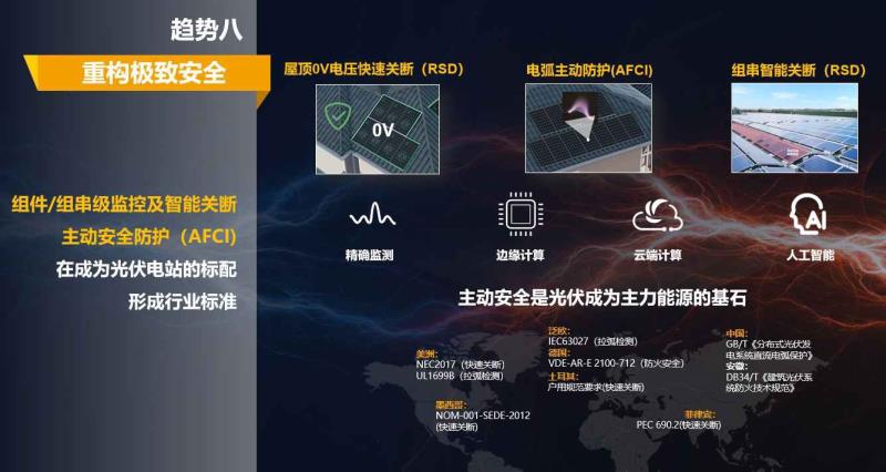 主動(dòng)安全是光伏成為主力能源的基石。“AI智能電弧防護(hù)”,是行業(yè)首次將AI算法融入AFCI,通過更精準(zhǔn)的電弧檢測,更迅速的故障保護(hù),全面保障分布式光伏的安全。未來5年,屋頂0V電壓快速關(guān)斷(RSD)、電弧主動(dòng)防護(hù)(AFCI)、組串智能關(guān)斷(RSD)在分布式屋頂將成為標(biāo)配,并形成行業(yè)國際標(biāo)準(zhǔn)。