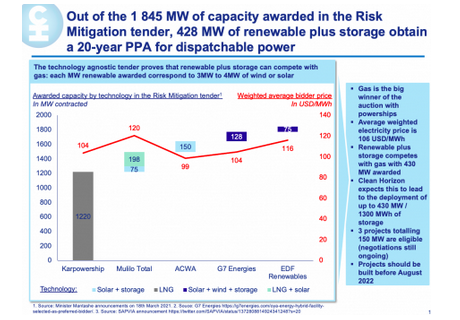 在此次招標中,可再生能源+儲能項目與天然氣發(fā)電項目在可調(diào)度電力容量合同方面展開了競爭。分析師Baschet表示,這與技術(shù)無關(guān)。他指出,天然氣發(fā)電設(shè)施的1MW代表1MW的合同容量,而可再生能源發(fā)電設(shè)施和儲能系統(tǒng)的可調(diào)度容量將分別代表3MW的可再生能源和1MW的儲能系統(tǒng),其儲能系統(tǒng)的放電持續(xù)時間為2至5個小時(取決于太陽能發(fā)電設(shè)施或風力發(fā)電設(shè)施的裝機容量)。