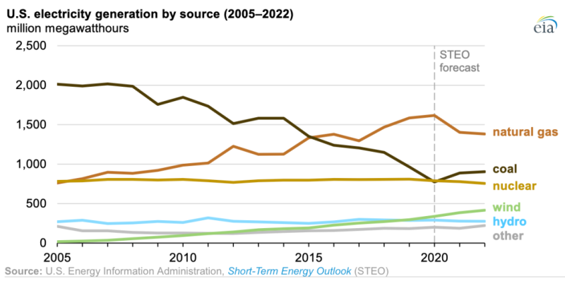 根據(jù)美國(guó)能源信息署(EIA)的數(shù)據(jù),2020年美國(guó)燃煤發(fā)電總量為7740億千瓦時(shí),低于天然氣發(fā)電(16000億千瓦時(shí))和核能發(fā)電(7900億千瓦時(shí))。這是自1949年以來,煤炭廠首次不是美國(guó)最大或第二大的發(fā)電來源。但是,EIA預(yù)計(jì)2021年和2022年,美國(guó)燃煤發(fā)電量將增加,核電發(fā)電量將減少。