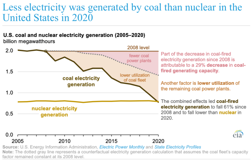隨著燃煤發(fā)電機(jī)組退役或改用其他燃料,以及剩余的燃煤發(fā)電機(jī)組使用率降低,美國(guó)的燃煤發(fā)電量持續(xù)減少。2008年美國(guó)燃煤發(fā)電裝機(jī)為313吉瓦,容量系數(shù)是72%;2020年煤炭的裝機(jī)容量已降至223吉瓦,容量系數(shù)已降至40%。