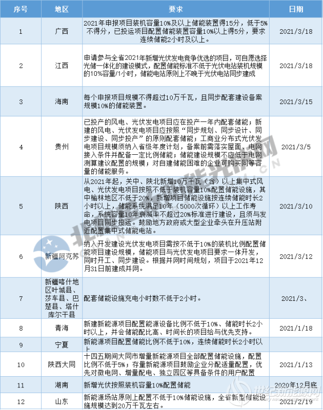 配置儲能已成為“十四五”期間建設光伏項目的必選項。據(jù)北極星太陽能光伏網(wǎng)統(tǒng)計,截至目前全國約20個地區(qū)出臺了光伏+儲能相關政策。2021開年以來,已有廣西、江西、貴州、山東、海南等12個地區(qū)要求新能源項目強配儲能,比例在5%~10%之間,連續(xù)儲能在2小時及以上。