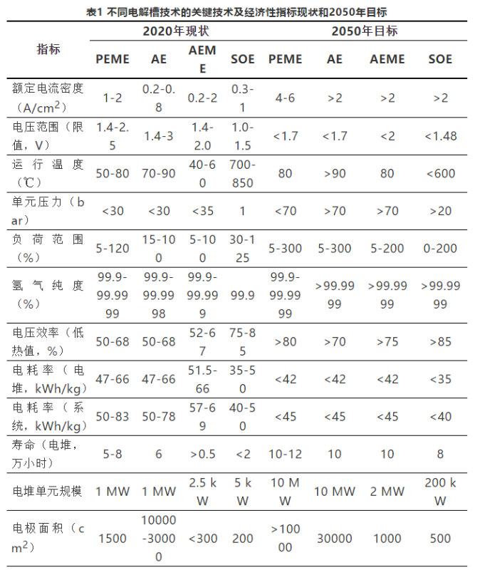 (3)電解槽技術(shù)性能現(xiàn)狀及2050年目標(biāo)