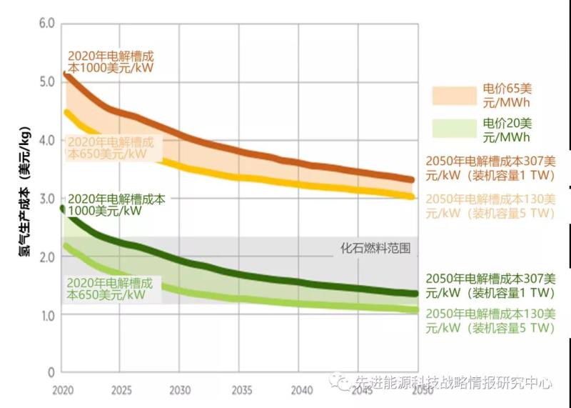 圖2 2020-2050年不同電價(jià)及電解槽成本變化下的綠氫成本預(yù)測(單位:美元/kg)