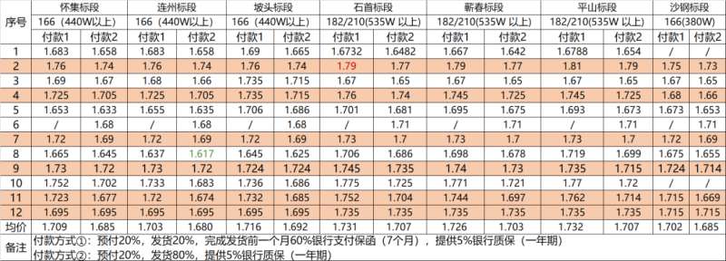 在本次集采中,按照付款條件的不同,組件投標(biāo)亦對(duì)應(yīng)兩種價(jià)格,根據(jù)最低價(jià)格來看,440W及以上組件的最低報(bào)價(jià)為1.617元/W,535W及以上最低報(bào)價(jià)為1.642元/W,皆來自二線組件企業(yè)。具體開標(biāo)價(jià)格見下: