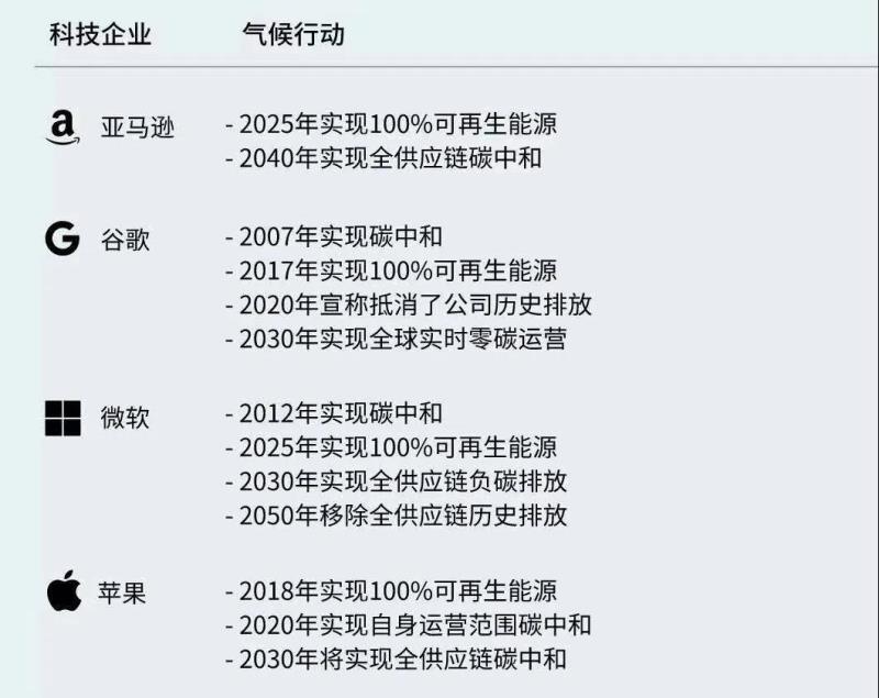 數(shù)據(jù)中心的市場前景廣闊,但同時對能耗和減排也提出了更高的挑戰(zhàn)。2018年中國數(shù)據(jù)中心總用電量為1609億千瓦時,約占中國全社會用電量的2%,總碳排放量達到9855萬噸,預(yù)計到2023年,中國數(shù)據(jù)中心總碳排放將達到1.63億噸[15]。在中央于2020年9月提出“雙碳”目標后,科技公司對于電力采購的規(guī)劃深受中央指引影響。目前,包括騰訊和螞蟻集團等互聯(lián)網(wǎng)科技企業(yè)已陸續(xù)提出啟動碳中和規(guī)劃。而早在2018年 ,國際互聯(lián)網(wǎng)企業(yè)蘋果、谷歌就已實現(xiàn)100%可再生能源目標。使用清潔電源供應(yīng)、實現(xiàn)全供應(yīng)鏈凈零碳排放早已成為這些數(shù)字科技企業(yè)的重要綠色名牌。