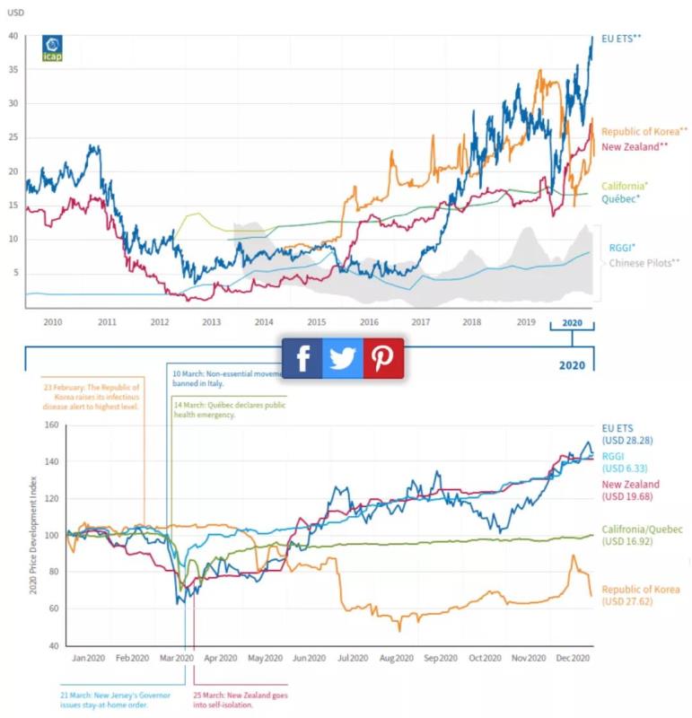 國際碳行動伙伴關系(ICAP)最新發(fā)布的《2021年全球排放交易狀況報告》認為,碳市場在疫情下表現(xiàn)出的韌性可能部分歸功于兩個因素。