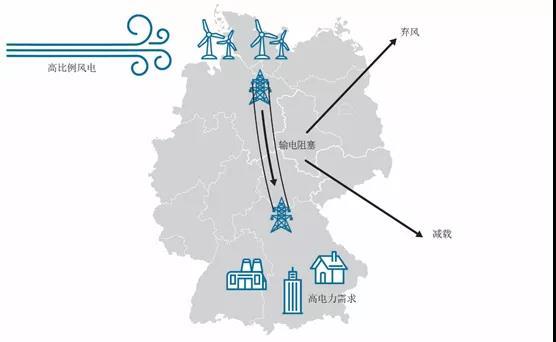 最知名的因電網(wǎng)阻塞導(dǎo)致VRE棄電的案例是德國電網(wǎng)的例子。德國三分之二的陸上風(fēng)電,和所有的海上風(fēng)電場都在德國的北部,但是工業(yè)用戶都位于南部。多年以來,德國電網(wǎng)并沒有足夠的電網(wǎng)容量來將北部的風(fēng)電輸送到南部,因而阻塞經(jīng)常發(fā)生。這導(dǎo)致北部發(fā)生了風(fēng)電棄電,南部熱力發(fā)電廠的高污染和昂貴電力消費還在攀升。這引起整體用能成本上升,見圖1。