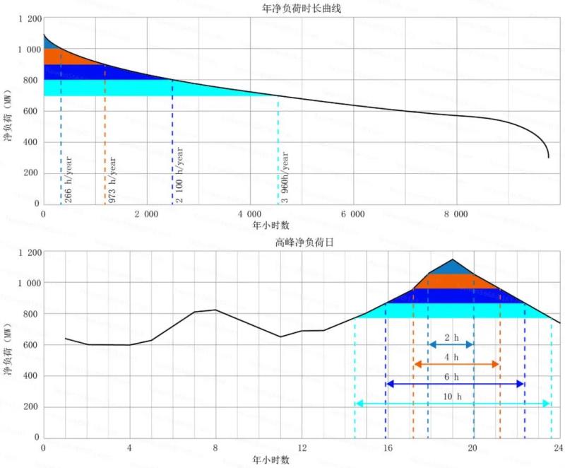 在本實(shí)例研究中,正如Stenclik 等人(2018)所述,必須考慮尖峰負(fù)荷減少的時(shí)長(zhǎng)效應(yīng)。這種效應(yīng)意味著儲(chǔ)能的時(shí)長(zhǎng)與本應(yīng)用有關(guān)。比如,在美國(guó),因?yàn)殡姵貎?chǔ)能可以提供4小時(shí)以上的放電時(shí)間,所以被認(rèn)為是一種可靠容量來(lái)源。如果少量的儲(chǔ)能可以覆蓋一定的高風(fēng)險(xiǎn)尖峰時(shí)段,這種假設(shè)是正確的。但是,當(dāng)儲(chǔ)能比例增加后,用于替代調(diào)峰電廠的4小時(shí)儲(chǔ)能的效用會(huì)降低,儲(chǔ)能時(shí)長(zhǎng)必須增加。