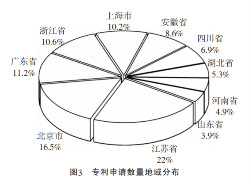 為研究氫能專利技術(shù),特別是加氫站專利技術(shù)的地域分布情況,對(duì)加氫站相關(guān)的817件專利按照專利權(quán)人所屬省份分類,江蘇省、北京市、廣東省、浙江省、上海市專利占有量分列前五,在加氫站技術(shù)發(fā)展中起到了先鋒作用。圍繞這五大省份建立華東、京津冀、華南、華中等氫能產(chǎn)業(yè)集群,發(fā)揮其技術(shù)優(yōu)勢(shì),建立起相對(duì)成熟的產(chǎn)業(yè)配套和商業(yè)化應(yīng)用體系,對(duì)氫能產(chǎn)業(yè)鏈的發(fā)展具有重要的推動(dòng)作用。專利申請(qǐng)數(shù)量地域分布見圖3。
