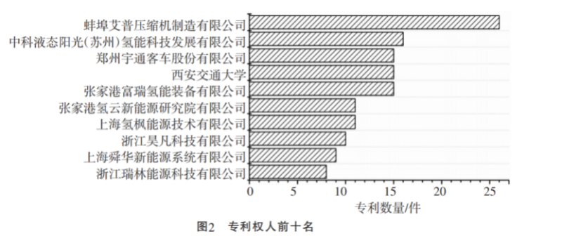 有數(shù)據(jù)統(tǒng)計(jì)顯示,高校和科研機(jī)構(gòu)是專利協(xié)同創(chuàng)新體系中的重要支撐,具有代表性和一定實(shí)力的企業(yè)可通過技術(shù)協(xié)作、合作開發(fā)、共建研發(fā)實(shí)體、共建聯(lián)合實(shí)驗(yàn)室、研究基金合作等形式,借助國內(nèi)高校、科研院所的力量推動(dòng)氫能產(chǎn)業(yè)的合作研發(fā)。加強(qiáng)企業(yè)與高校、研究院所的合作,實(shí)現(xiàn)互相支持、互相滲透、互相介入、優(yōu)勢(shì)互補(bǔ)、資源互用、利益共享是促進(jìn)技術(shù)管理現(xiàn)代化的重要途徑。在加氫站技術(shù)中,企業(yè)發(fā)揮了創(chuàng)新主體的作用,但是在中國當(dāng)前大背景下,高校、研究院所的科技人力資源還應(yīng)發(fā)揮其創(chuàng)新主力的作用,使企業(yè)的主體地位與高校、研究院所的主力作用有機(jī)統(tǒng)一起來。專利權(quán)人前十名情況見圖2。