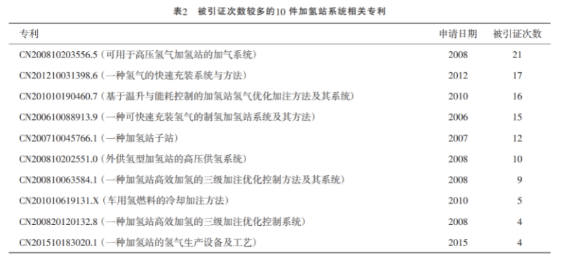 專利對(duì)其他專利文獻(xiàn)的引用體現(xiàn)了技術(shù)發(fā)展的規(guī)律、技術(shù)之間的繼承和積累,以及不同技術(shù)的交叉和滲透,同時(shí)也是專利價(jià)值的體現(xiàn)。被引證次數(shù)較多的10件加氫站系統(tǒng)相關(guān)專利見表2,主要涉及加氫站的氫氣生產(chǎn)設(shè)備、高壓供氫系統(tǒng)、加氫站的加氣系統(tǒng)、加氫控制系統(tǒng)、快速充裝氫氣的系統(tǒng)與方法、溫升與能耗控制方法、冷卻加注方法、氫燃料加注和卸載系統(tǒng)等多個(gè)技術(shù)領(lǐng)域。