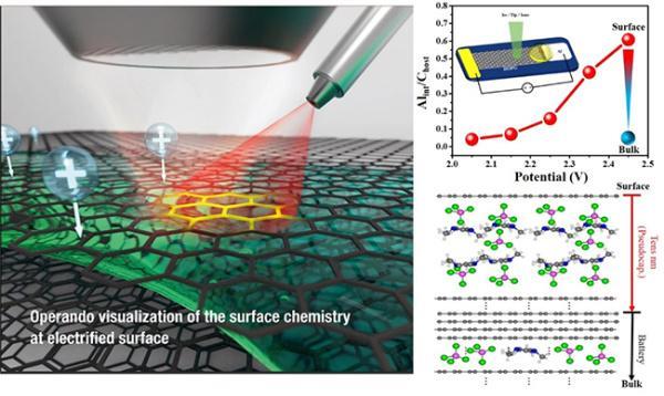 Langmuir、Ertl 等人建立起來的表面化學方法學能夠獲得固體表面結(jié)構(gòu)和化學信息,已在多相催化等領(lǐng)域中取得成功,但將這些技術(shù)應用到電化學過程的原位表界面表征仍充滿挑戰(zhàn)。近年來,傅強團隊探索利用表面化學方法學來研究電化學表界面問題。該工作中,研究人員通過長期探索,構(gòu)建出適合原位表面表征的模型電池,設(shè)計了一系列相關(guān)的原位樣品池和樣品臺,實現(xiàn)了對鋁離子電池過程的多種在線表界面表征,包括 XPS、AFM、SKPM、Raman、掠角 XRD 等。研究發(fā)現(xiàn),充電過程中石墨電極表面區(qū)域陽離子(EMI+)與陰離子(AlCl4-)共插層嵌入到石墨層間,證實電極表面區(qū)域的插層離子超富集現(xiàn)象;基于電極過程的精準在線測量,研究人員首次給出鋁離子電池電極反應的定量描述,揭示儲能電極存在明顯的表面效應,利用該效應構(gòu)建以超薄石墨為電極的電池器件實現(xiàn)了容量翻倍。