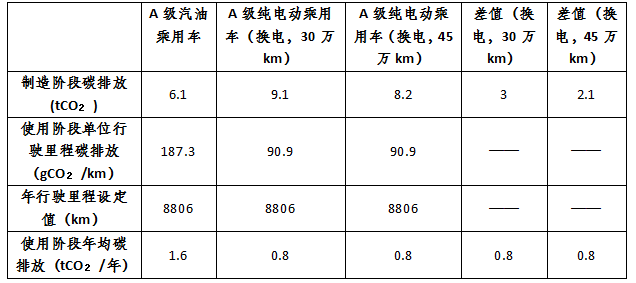 另外,換電模式下,動力蓄電池利用率較高,將A級純電動汽車減排滯后期降低到2年~4年(如下表所示),即A級純電動汽車使用2年~4年即可抵消其生產(chǎn)階段較A級汽油車高出的碳排放。