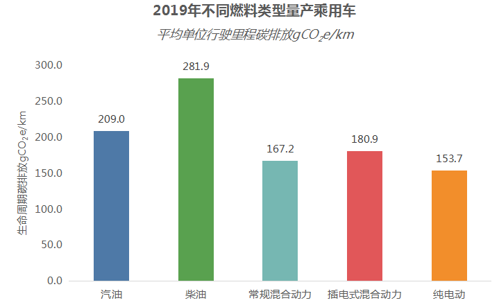 圖1 2019年不同燃料類型量產(chǎn)乘用車平均單位行駛里程碳排放