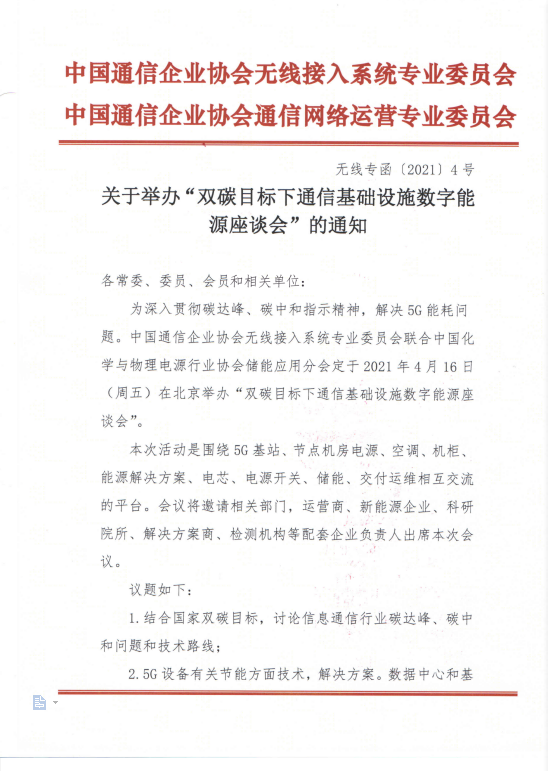 為深入貫徹碳達峰、碳中和指示精神,解決5G能耗問題。中國通信企業(yè)協(xié)會無線接入系統(tǒng)專業(yè)委員會聯(lián)合中國化學(xué)與物理電源行業(yè)協(xié)會儲能應(yīng)用分會定于2021年4月16日(周五)在北京舉辦“雙碳目標(biāo)下通信基礎(chǔ)設(shè)施數(shù)字能源座談會”。