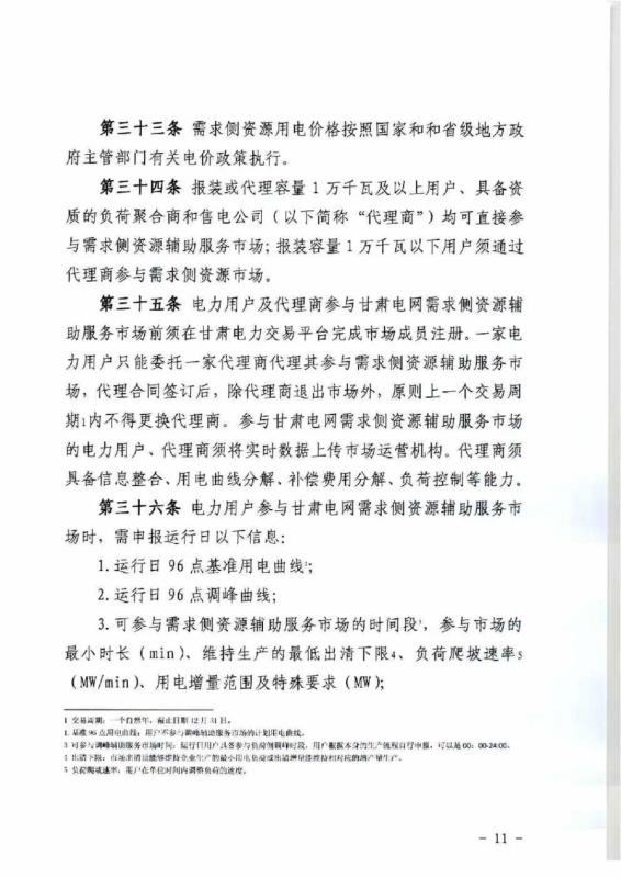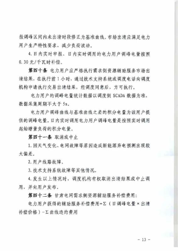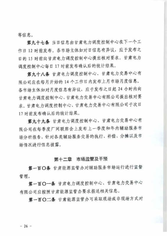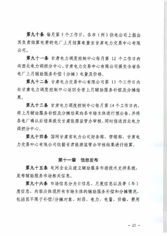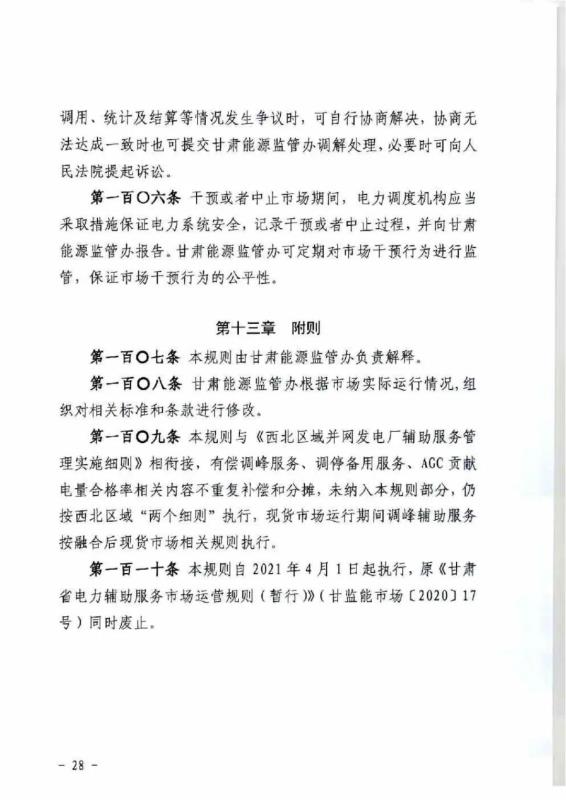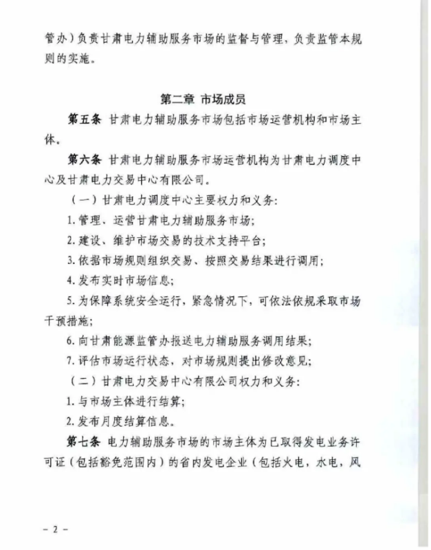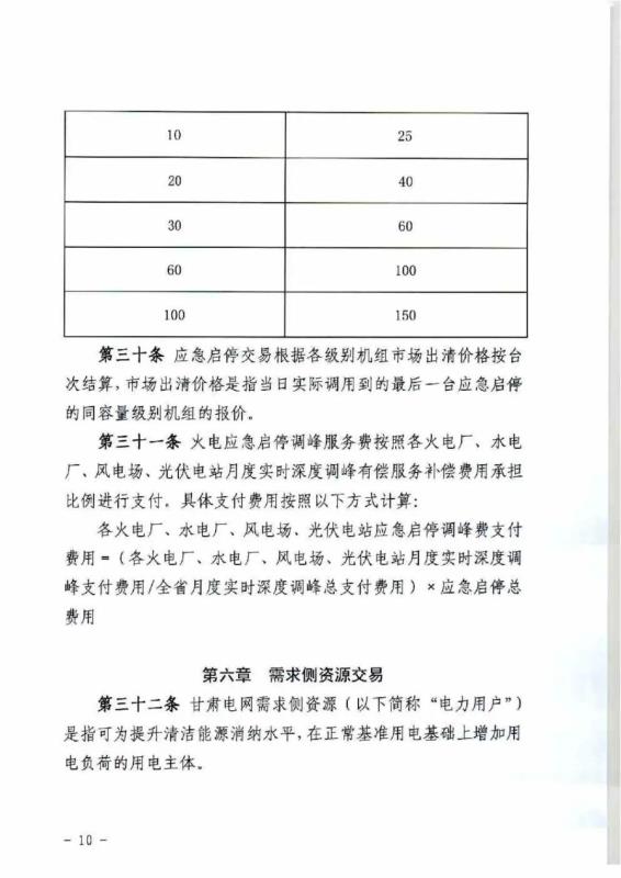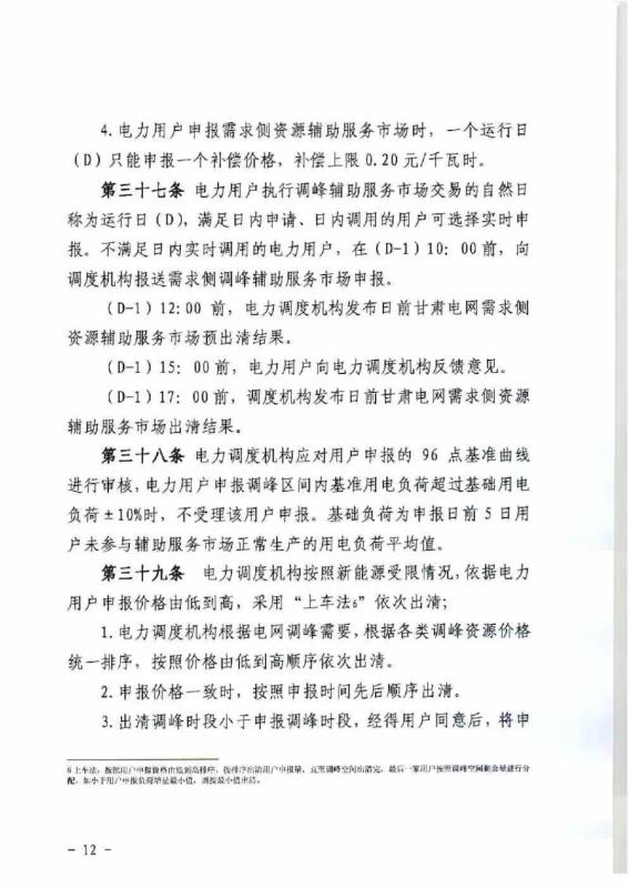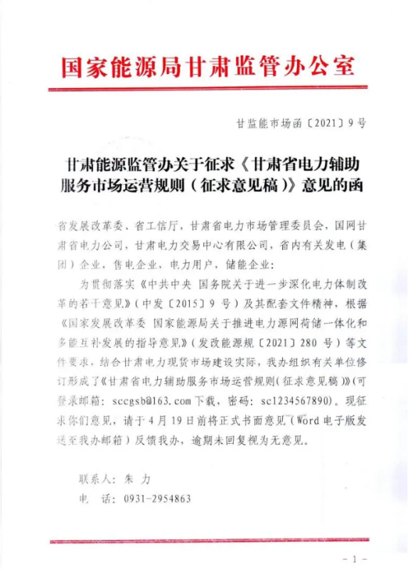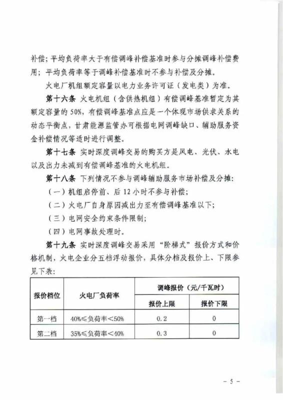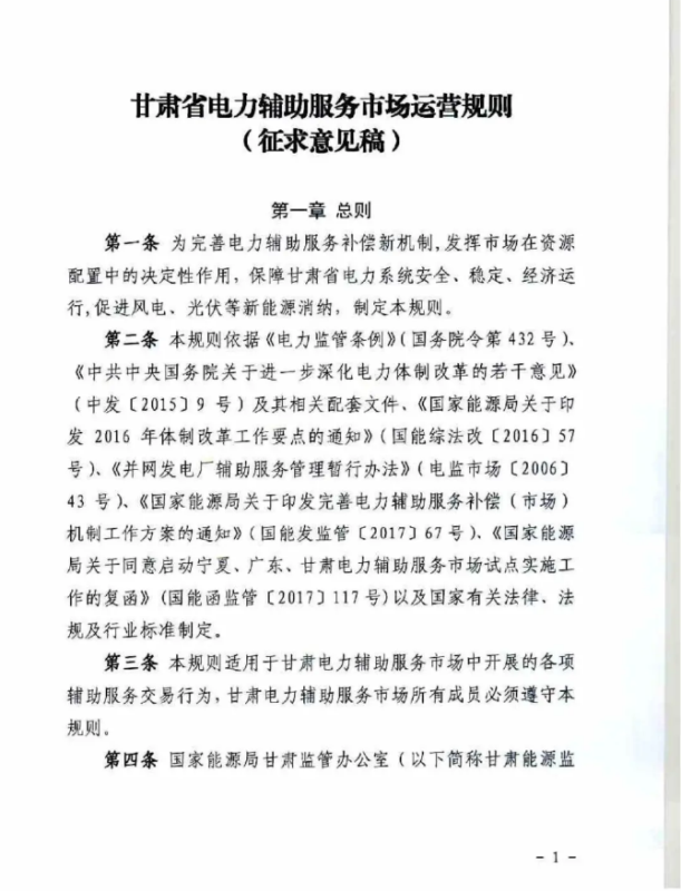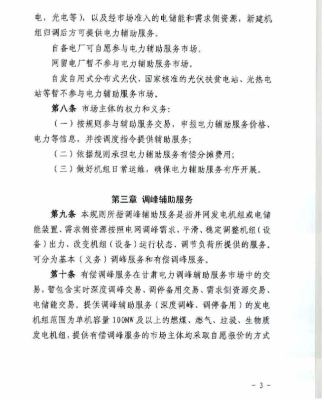 中國儲能網(wǎng)訊:4月10日,國家能源局甘肅監(jiān)管辦公室發(fā)布關于征求《甘肅省電力輔助服務市場運營規(guī)則(征求意見稿)》意見的函,意見稿規(guī)則較2019年發(fā)布的暫行補償價格有較大改變。調(diào)頻輔助服務補償價格由上限15元/MW下調(diào)至12元/MW。調(diào)峰輔助服務申報價格非現(xiàn)貨期間為0.5元/kWh,現(xiàn)貨期間為0.3元/kWh。
