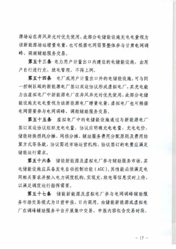 在新能源場站計量出口內(nèi)建設的5MW/10MWh及以上電儲能設施,可與新能源場站作為整體,參與調(diào)峰、調(diào)頻輔助服務市場。其充電電量可優(yōu)先使用新能源棄風棄光電量,且視為新能源場站增發(fā)電量。