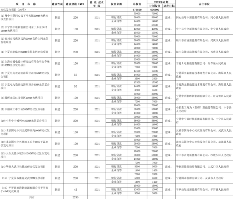 中國儲能網(wǎng)訊:4月7日,寧夏自治區(qū)發(fā)展改革委關于印發(fā)《2021年自治區(qū)重點項目投資計劃》的通知,據(jù)光伏們整理,其中光伏電站項目16個,涉及項目業(yè)主包括中國電建、隆基、京能、天合光能、華潤等多家企業(yè),總規(guī)模達2.295GW。項目分布在寧夏自治區(qū)的同心縣、中寧縣、興慶區(qū)、紅寺堡、海原縣、靈武市、鹽池縣、沙坡頭區(qū)、大武口區(qū)、平羅縣等地,項目總投資規(guī)模67.65億元。