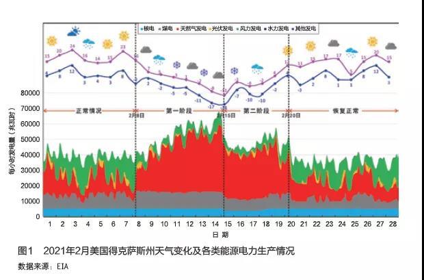 罕見的寒潮天氣在2021年2月份席卷了美國得克薩斯州,得州電力系統(tǒng)遭受重創(chuàng),數(shù)百萬用戶斷電、電價(jià)飆升、電力運(yùn)營商申請(qǐng)破產(chǎn),造成了大量的人員傷亡和財(cái)產(chǎn)損失。得州新能源發(fā)電系統(tǒng)在極寒天氣中大范圍停擺,風(fēng)力發(fā)電量約下降60%,光伏發(fā)電量約下降68%,核電及煤電的發(fā)電量分別下降26%和28%。天然氣發(fā)電在關(guān)鍵時(shí)刻發(fā)揮了“頂梁柱”作用,發(fā)電量上升約158%,彌補(bǔ)了大量電力缺口。