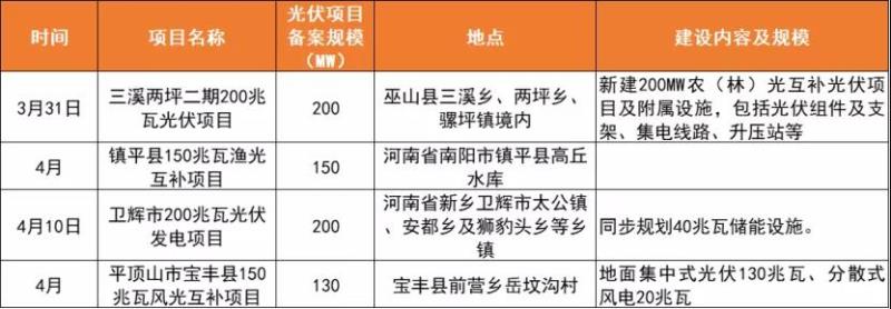 據(jù)三峽新能源官方消息,近日,三峽新能源于河南、重慶備案680MW項目,涉及農(nóng)(林)光、漁光、風光互補等多種形式。光伏們整理了公示的備案項目情況,如下所示: