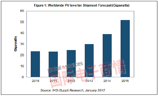 但是,今年光伏逆變器出貨量預(yù)計將恢復(fù)增長,有望上升5%至24.5GW,并在接下來的三年連續(xù)擴張,如圖所示。雖然2012年銷售額將繼續(xù)下滑,但降幅將縮小到只有3%,隨后將在新市場的推動下恢復(fù)增長,到2014年增長率將上升到20%左右。