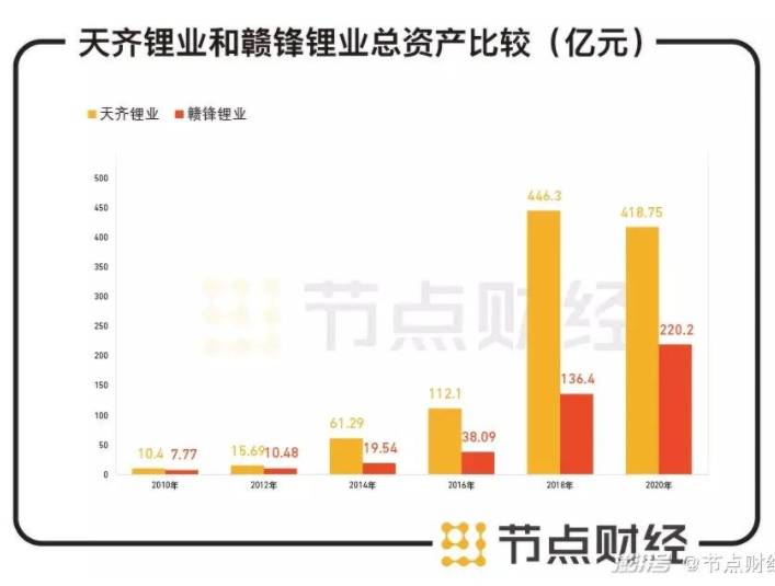 在2010年上市之初,天齊鋰業(yè)和贛鋒鋰業(yè)兩家公司的規(guī)模都很小,總資產(chǎn)不過才10.4億元、7.77億元。截至2020年末,兩家公司的總資產(chǎn)已達(dá)到418.75億元、220.2億元,規(guī)模漲幅超過40倍、28倍。