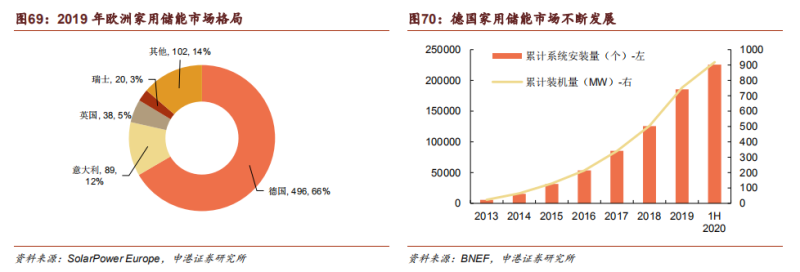 德國(guó)是歐洲家用儲(chǔ)能市場(chǎng)領(lǐng)導(dǎo)者,2019 年新增裝機(jī)量占比達(dá)到 66%。雖然受到新冠疫情影響,德國(guó)家用儲(chǔ)能市場(chǎng)在 2020Q1 仍保持較好增勢(shì),累計(jì)裝機(jī)即將突破1000MW。