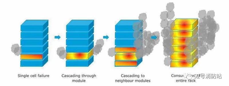 即某節(jié)鋰電池發(fā)生故障進(jìn)入熱失控狀態(tài),其所在模組過(guò)熱后,因缺乏有效隔熱措施,導(dǎo)致其他模組連鎖受熱進(jìn)入熱失控狀態(tài)并釋放大量氣體,電站箱體內(nèi)的暖通設(shè)備在煙感探測(cè)器告警后自動(dòng)停止運(yùn)轉(zhuǎn),箱體本身也沒(méi)有設(shè)置合適的通風(fēng)設(shè)備,導(dǎo)致箱體內(nèi)可燃?xì)怏w高度積聚。