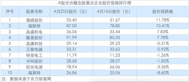 股價方面,本周,光伏企業(yè)6家股價出現(xiàn)下降,4家股票實現(xiàn)較大漲幅。其中,通威股份、福斯特股價均漲超10%;福萊特股價繼4月16日跌8.6%后,股價猛下坡再跌8.6%。