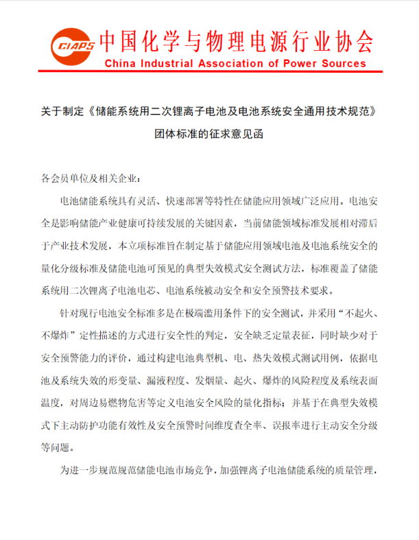 為進(jìn)一步規(guī)范規(guī)范儲(chǔ)能電池市場(chǎng)競(jìng)爭(zhēng),加強(qiáng)鋰離子電池儲(chǔ)能系統(tǒng)的質(zhì)量管理,引導(dǎo)儲(chǔ)能產(chǎn)業(yè)電池安全技術(shù)升級(jí),電池儲(chǔ)能系統(tǒng)在設(shè)計(jì)、選型、驗(yàn)證有標(biāo)準(zhǔn)可依,推動(dòng)電池儲(chǔ)能系統(tǒng)健康發(fā)展。中國(guó)化學(xué)與物理電源行業(yè)協(xié)會(huì)擬啟動(dòng)《儲(chǔ)能系統(tǒng)用二次鋰離子電池及電池系統(tǒng)安全通用技術(shù)規(guī)范》協(xié)會(huì)團(tuán)體標(biāo)準(zhǔn)編制工作。