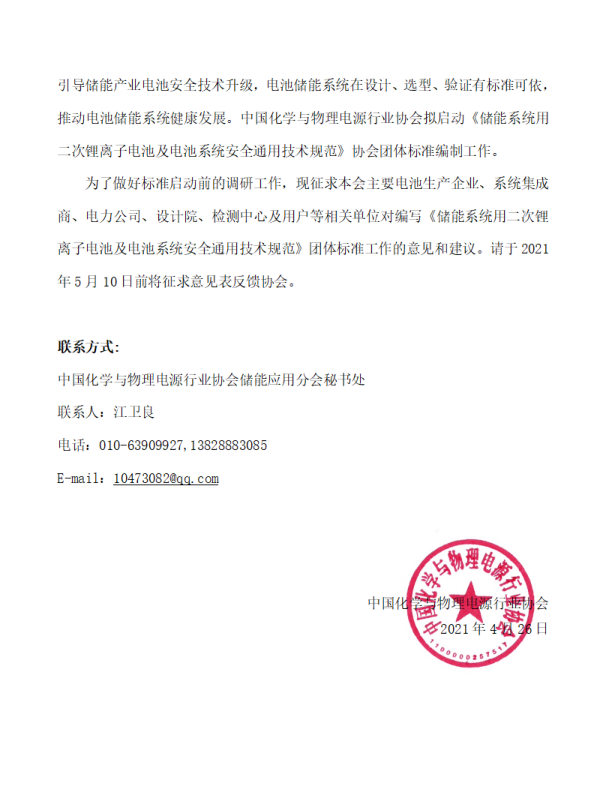 為了做好標(biāo)準(zhǔn)啟動(dòng)前的調(diào)研工作,現(xiàn)征求本會(huì)主要電池生產(chǎn)企業(yè)、系統(tǒng)集成商、電力公司、設(shè)計(jì)院、檢測(cè)中心及用戶等相關(guān)單位對(duì)編寫《儲(chǔ)能系統(tǒng)用二次鋰離子電池及電池系統(tǒng)安全通用技術(shù)規(guī)范》團(tuán)體標(biāo)準(zhǔn)工作的意見和建議。請(qǐng)于2021年5月10日前將征求意見表反饋協(xié)會(huì)。
