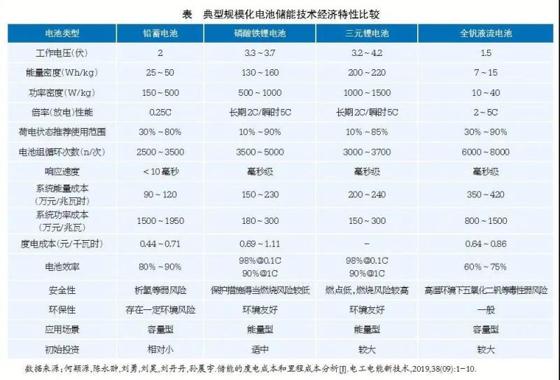 電化學儲能主要包括鉛蓄電池、鋰離子電池、液流電池、鈉硫電池等。目前用于規(guī)?;瘍δ艿碾姵刂饕糟U蓄、鋰離子和全釩液流電池為主,這三類典型規(guī)模化儲能電池的技術經(jīng)濟特性如表所示。從表中各項指標的綜合比較可以得出各電池技術參數(shù)的優(yōu)劣勢。綜合各項指標數(shù)據(jù)來看,磷酸鐵鋰電池相對更優(yōu),是當前我國電池儲能技術推廣應用的主流技術。此外,相比較抽水蓄能等其他儲能方式,電池儲能電站具有以下五個方面的優(yōu)勢:第一,設計靈活、配置方便,采用模塊化設計,基本上不受地理條件的限制;第二,響應速度快,毫秒級時間尺度內(nèi)實現(xiàn)額定功率范圍內(nèi)的有功無功的輸入和輸出;第三,精準控制,能夠在可調(diào)范圍內(nèi)的任何功率點保持穩(wěn)定輸出;第四,具有雙向調(diào)節(jié)能力,既可以充電作為用電負荷,又可以放電作為電源,具有額定功率雙倍的調(diào)節(jié)能力;第五,電池儲能電站技術相對成熟,建設周期短,能夠快速響應應用需求。正是由于電池儲能技術具有上述優(yōu)勢,使得其廣泛應用于配合平抑新能源出力波動、提高電能質(zhì)量、削峰填谷、調(diào)峰調(diào)頻、提高供電能力、提高孤立電網(wǎng)穩(wěn)定性及作為應急備用電源提供供電可靠性等多個方面。