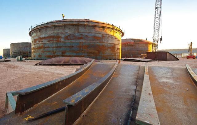 圖|美國(guó)亞利桑那州索拉納太陽(yáng)能電站的熔鹽儲(chǔ)熱罐,借助熔鹽保持的熱度該電站夜間可釋放電力6小時(shí)。