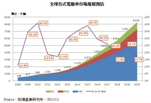 2020年前全球新能源車市場成長動能主要以油電混合車(Hybrid Electric Vehicle;HEV)為主,預(yù)計(jì)目前仍為全球電動車銷售上升主力,約占整體電動車市場70%。2011年后隨著鋰電池技術(shù)漸趨成熟,插電式油電混合車(Plug-in Hybrid Electric Vehicle;PHEV)市場逐漸起飛,2012年起將呈顯著成長,2020年銷售量將達(dá)150萬輛,占整體電動車市場的18%,而完全仰賴電池做為動力來源的純電動車(Battery only Electric Vehicle;BEV),由于各國政策推動期程不一,現(xiàn)仍處于示范運(yùn)行階段,預(yù)計(jì)2020年占整體電動車市場的12%。