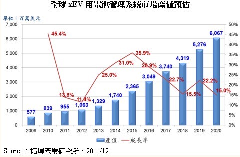 因此,透過BMS能準(zhǔn)確量測電池組使用狀況,保護(hù)電池不至于過度充放電,平衡電池組中每一顆電池的電量,以及分析計(jì)算電池組的電量并轉(zhuǎn)換為駕駛可理解的續(xù)航力信息,確保動力電池可安全運(yùn)作。拓墣預(yù)測2012年全球BMS市場產(chǎn)值成長逾10%,2013年至2015年成長幅度將大幅躍升至25%~35%。