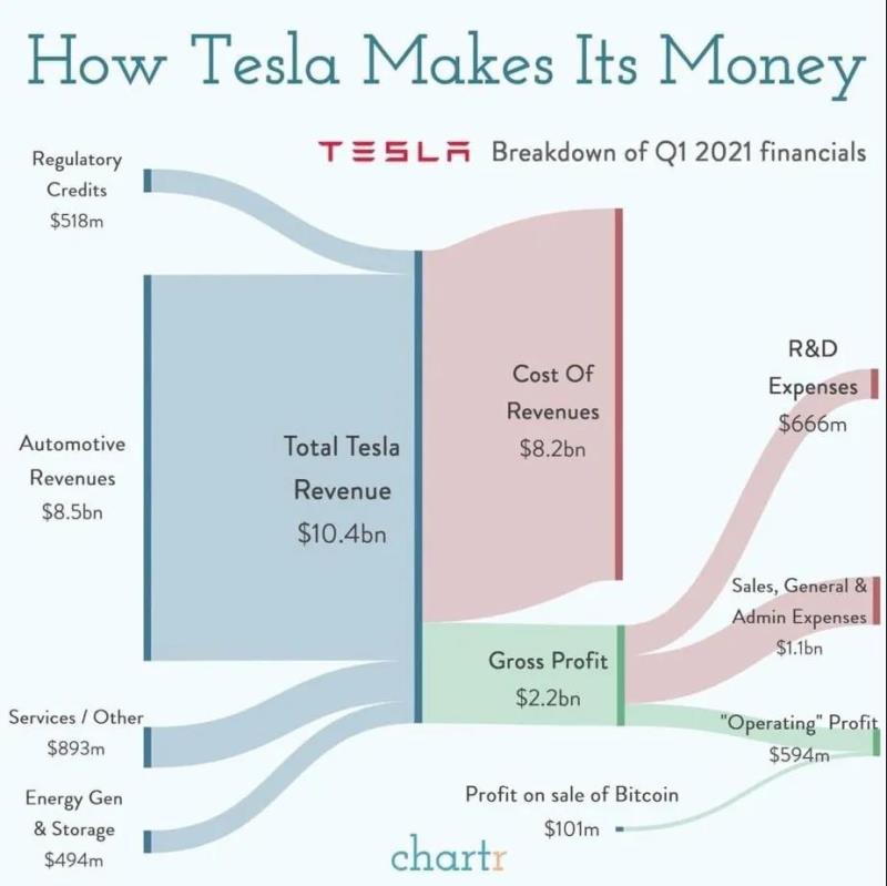 這些收入刨去82億美元的生產(chǎn)成本,毛利潤為22億美元。毛利潤中有6.66億美元用于研發(fā),11億美元用于銷售和行政開支,營運凈利潤為5.94億美元。此外,特斯拉還靠出售比特幣賺了1.01億美元。