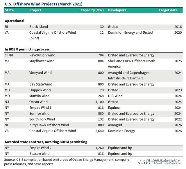 目前美國只有42MW的海上風(fēng)電在運行(包括羅德島30MW和CVOW2臺6MW實驗機組),但另有約12GW的項目處于開發(fā)狀態(tài),下表列出了目前處于計劃或正在審批中的項目。
