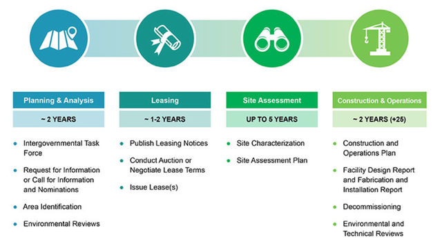 BOEM提供了海上風(fēng)電開發(fā)的具體流程【16】。首先,開發(fā)商必須在BOEM拍賣中獲得租賃權(quán)。接下來,BOEM將批準(zhǔn)開發(fā)人員的現(xiàn)場評估計劃,包括將如何進行資源評估和測試技術(shù)等。最后,開發(fā)人員必須提交一份施工和運營計劃,詳細(xì)說明了該項目計劃的所有施工和活動,包括退役計劃。BOEM還會按照《國家環(huán)境政策法》的要求執(zhí)行環(huán)境影響聲明,只有通過環(huán)境審查后才能得到環(huán)保局的批準(zhǔn),開發(fā)商才可以開始施工。