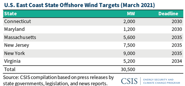 盡管美國還沒有什么大型海上風(fēng)電項目在開工建設(shè),但美國幾個東部州正爭先恐后地設(shè)定雄心勃勃的目標(biāo)。紐約以2035年安裝9GW海上風(fēng)電目標(biāo)領(lǐng)先【10】,新澤西州以7.5GW的目標(biāo)緊隨其后【11】,馬薩諸塞州的目標(biāo)是5.6GW,再加上馬里蘭州、弗吉尼亞州這些州,總的裝機目標(biāo)已略高于拜登宣布的2030年30GW的目標(biāo)。
