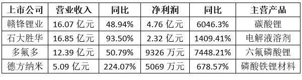 碳酸鋰價格的上漲直接推高了磷酸鐵鋰和六氟磷酸鋰等碳酸鋰下游材料的成本。受此影響,下游也掀起“漲價潮”。在產(chǎn)品漲價助攻下,相關(guān)上市公司業(yè)績也非常亮眼。