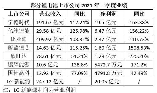 近日,動力電池產(chǎn)業(yè)鏈上市公司陸續(xù)發(fā)布了2021年度一季度業(yè)績報告。由于2020年第一季度國內(nèi)受新冠疫情影響,多數(shù)產(chǎn)業(yè)被迫停產(chǎn),業(yè)績數(shù)據(jù)較差,因而在國內(nèi)經(jīng)濟(jì)得到穩(wěn)健恢復(fù)的2021年,鋰電產(chǎn)業(yè)鏈上市公司絕大多數(shù)業(yè)績出現(xiàn)大幅增長。