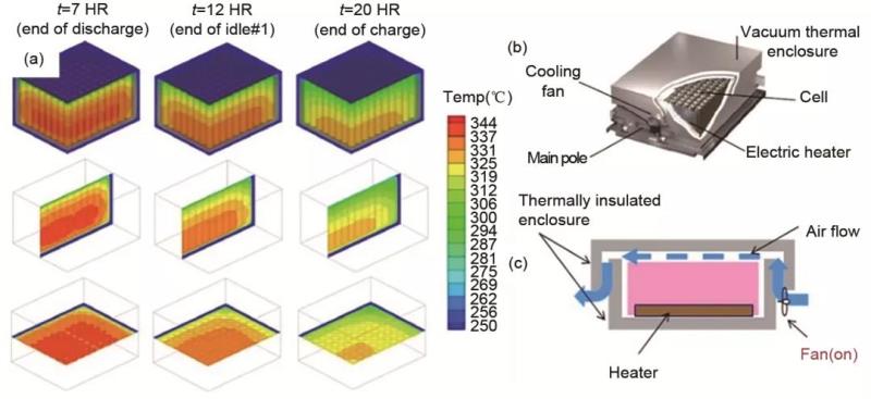 圖14 (a) 充放電過程中電池保溫箱內(nèi)部溫度場分布的模擬結(jié)果;(b,c) NGK的L33型模組的風(fēng)道設(shè)計(jì)
