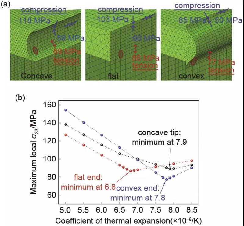 圖11 (a) 凸、平和凹三種尖端形狀的玻璃密封件在熱震過程中承受的局部應(yīng)力計(jì)算結(jié)果;(b) 最大局部應(yīng)力與玻璃熱膨脹系數(shù)之間的關(guān)系