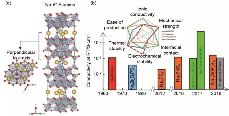 圖8 (a) β"-Al2O3的晶體結(jié)構(gòu);(b) 鈉離子固體電解質(zhì)的發(fā)展歷程與相關(guān)特性網(wǎng)圖