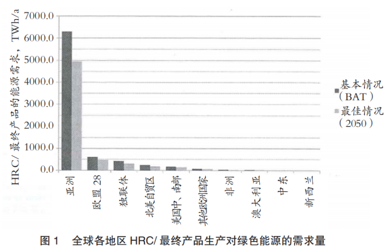 將全球煉鋼生產(chǎn)從碳基轉(zhuǎn)型為氫基工藝,在基本情況下,生產(chǎn)HRC的綠色能源需求量為7920TWh/a,在最佳情況下,為6210TWh/a。相應(yīng)所需的氫氣量將在13000億到11200億m3(STP)之間。圖1和圖2給出了HRC/最終產(chǎn)品按區(qū)域劃分的綠色能源需求。對于HRC生產(chǎn),亞洲目前擁有最大的綠色能源需求量(基本情況為6300TWh/a;最佳情況為4940TWh/a),其次是歐盟(基本情況為610TWh/a;最佳情況為480TWh/a)和獨(dú)聯(lián)體國家(基本情況為420TWh/a;最佳情況為310TWh/a)。