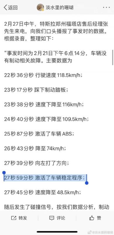 張女士于4月25日結(jié)束拘留后,再次對特斯拉公布的數(shù)據(jù)提出質(zhì)疑,表示該數(shù)據(jù)與2月27日特斯拉工作人員向其口頭播報事發(fā)前6秒鐘數(shù)據(jù)對照,有部分數(shù)據(jù)缺失。