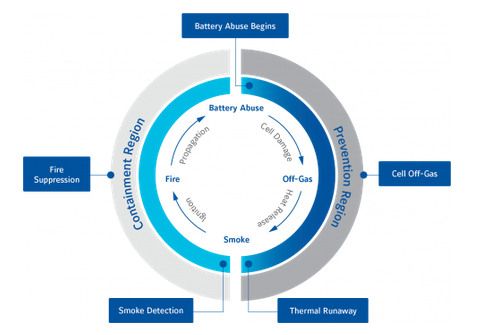 為了防止此類事件再次發(fā)生,了解電池故障的各個(gè)階段至關(guān)重要??梢詣澐譃轭A(yù)防和控制區(qū)域,并且分為四個(gè)階段: