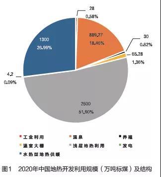 綜合供暖、發(fā)電、溫泉、養(yǎng)殖以及農(nóng)業(yè)等領(lǐng)域地?zé)嵫b機(jī)容量以及供暖制冷面積等數(shù)據(jù)測(cè)算,到2020年,中國(guó)地?zé)釋?shí)際利用量折合4800萬(wàn)噸標(biāo)煤,完成規(guī)劃目標(biāo)的近70%?,F(xiàn)有地?zé)崮芾媒Y(jié)構(gòu)中,淺層地?zé)崂梦痪邮孜唬急?2%;其次是水熱型地?zé)峁┡?,占?7%,繼續(xù)保持增長(zhǎng);再次是溫泉利用,占比18%,其余利用方式占比3%(見(jiàn)圖1)。